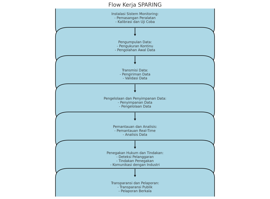 Industries falling under SPARING regulations are required to install and maintain a real-time, online wastewater quality monitoring system. This system continuously collects data on the aforementioned parameters and transmits it directly to KLHK’s database server. This real-time data stream allows for: